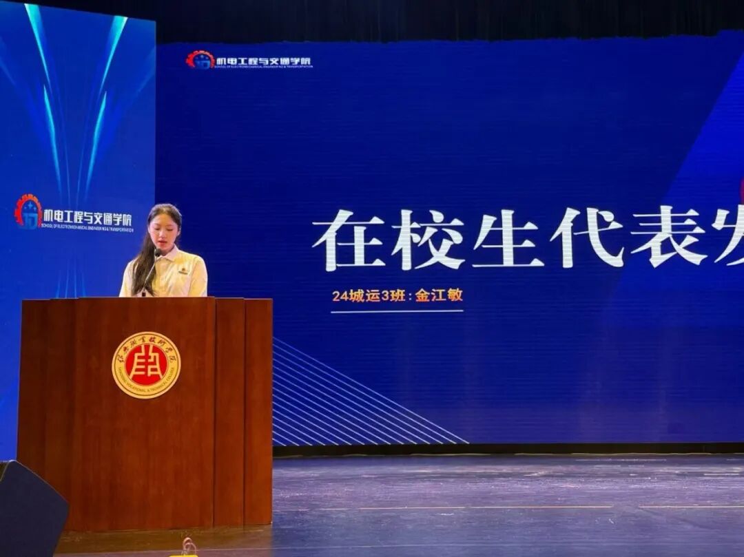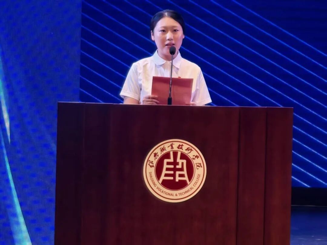 许嘉琦作为新生代表发言:绍职院是梦想启航、青春绽放的舞台,未来将以 “守正创新” 校训与 “专业成才,精神成人” 理念搭建实践桥梁。身为城轨专业生,她愿学好专业、助力绍兴交通;最后她号召同学在大学练本领、践服务,以毅力循 “工匠精神” 奋斗,做实干追光者。