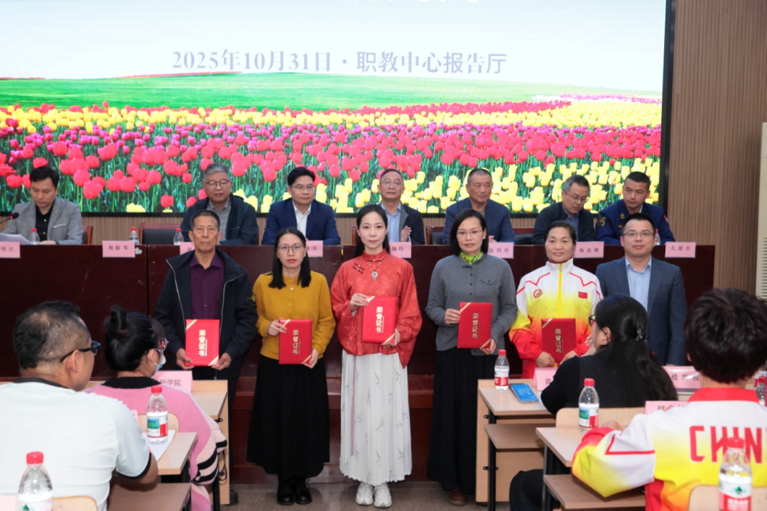 10 月 31 日晚,2025 年秋季 “风信子” 职工公益培训开训仪式在诸暨市职教中心启正楼一楼多功能报告厅隆重举行。受诸暨市总工会邀请,我院副院长、诸暨市店口新时代产业工人培训学校(绍兴职业技术学院诸暨产业学院)校长祝新军,副校长金丹,学员服务部部长田红梅出席仪式。期间,祝新军校长代表学校为公益培训优秀教师颁发荣誉证书。