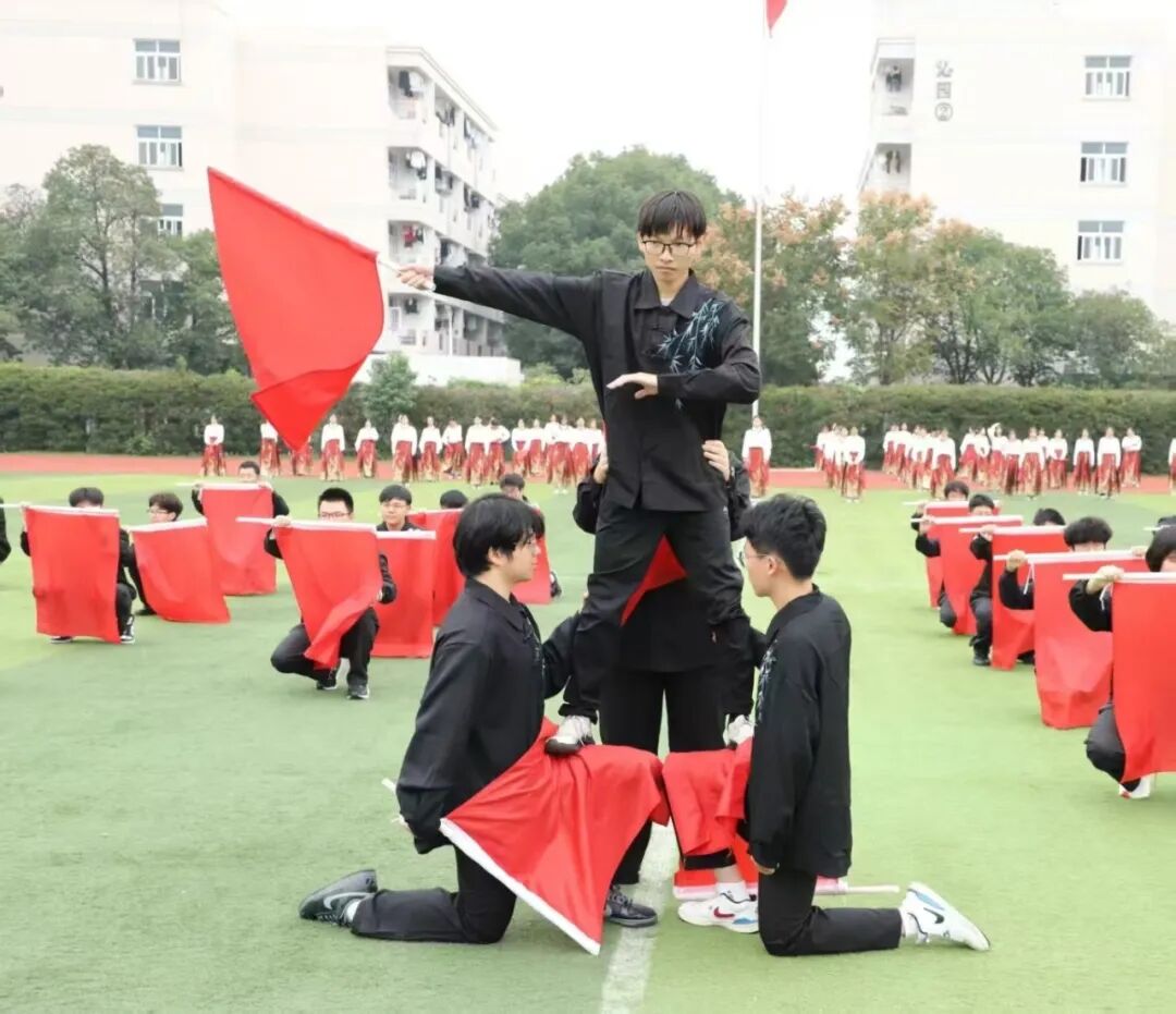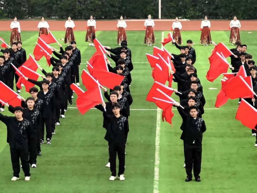专业之美:节奏与力度的交响表演在铿锵的节奏中拉开序幕。男生方阵手持代表轨道交通行业的信号旗,动作精准划一,起落间传递着指令的严谨,挥舞中诠释着安全的千钧之重。这不仅是动作的展示,更是专业规范与职业精神的美学转化,让同学们在身体律动中深化对工匠精神的体认。