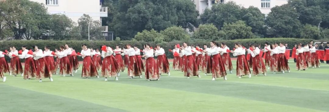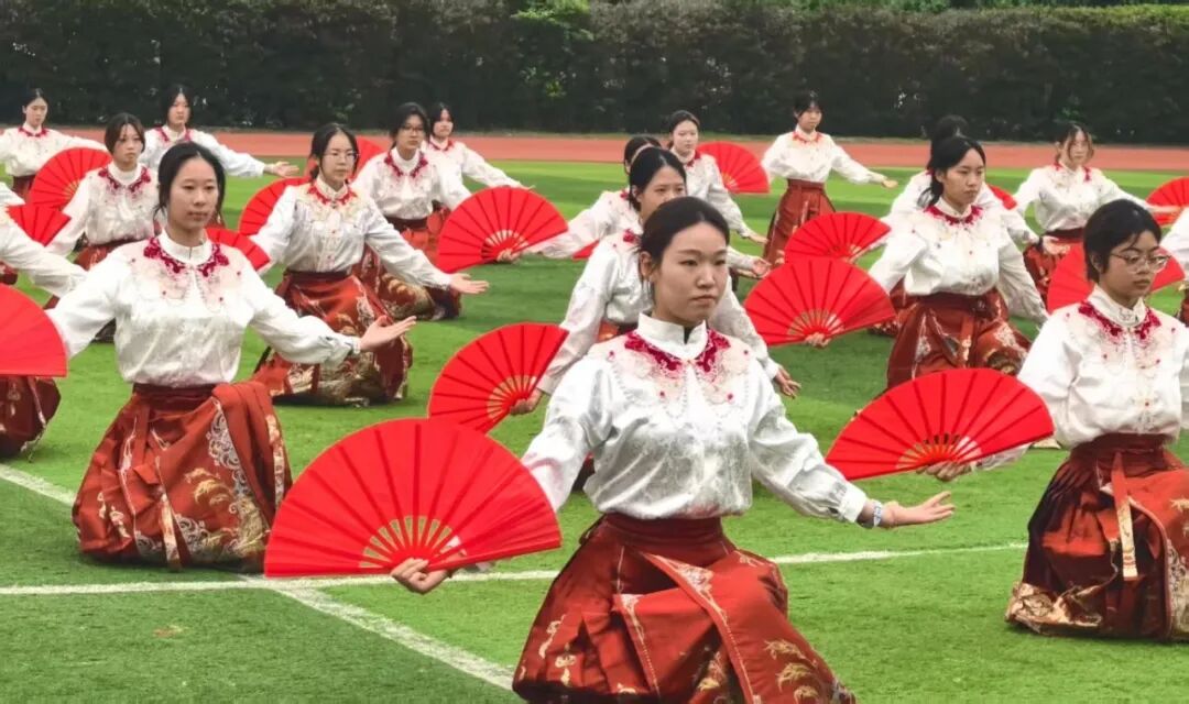 人文之美:优雅与温度的流淌随后,女生方阵手持红扇,翩然入场。她们以流畅优雅的队形变换,构建出流动的画卷,生动塑造了未来轨道交通服务者专业、温婉的形象。红扇翻飞,舞步轻盈,这一刻,技术与人文的完美融合,展现出交通服务应有的温度与美感,体现了学院在美育中塑造学生完整人格的育人理念。